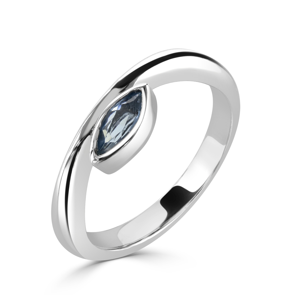 Kiri in 9ct White gold set with a London blue topaz measuring 6mm x 4mm set into a rubover setting. The band is in a wave design and measures 2.5mm at the widest point and 2mm at the narrowest point. The wave in each ring is designed to flow with the contours of your hand so please choose left of right hand options when picking finger size. If worn on the opposite hand the ring looks straigher but still gorgeous. The gold is polished so it has a beautiful shine.